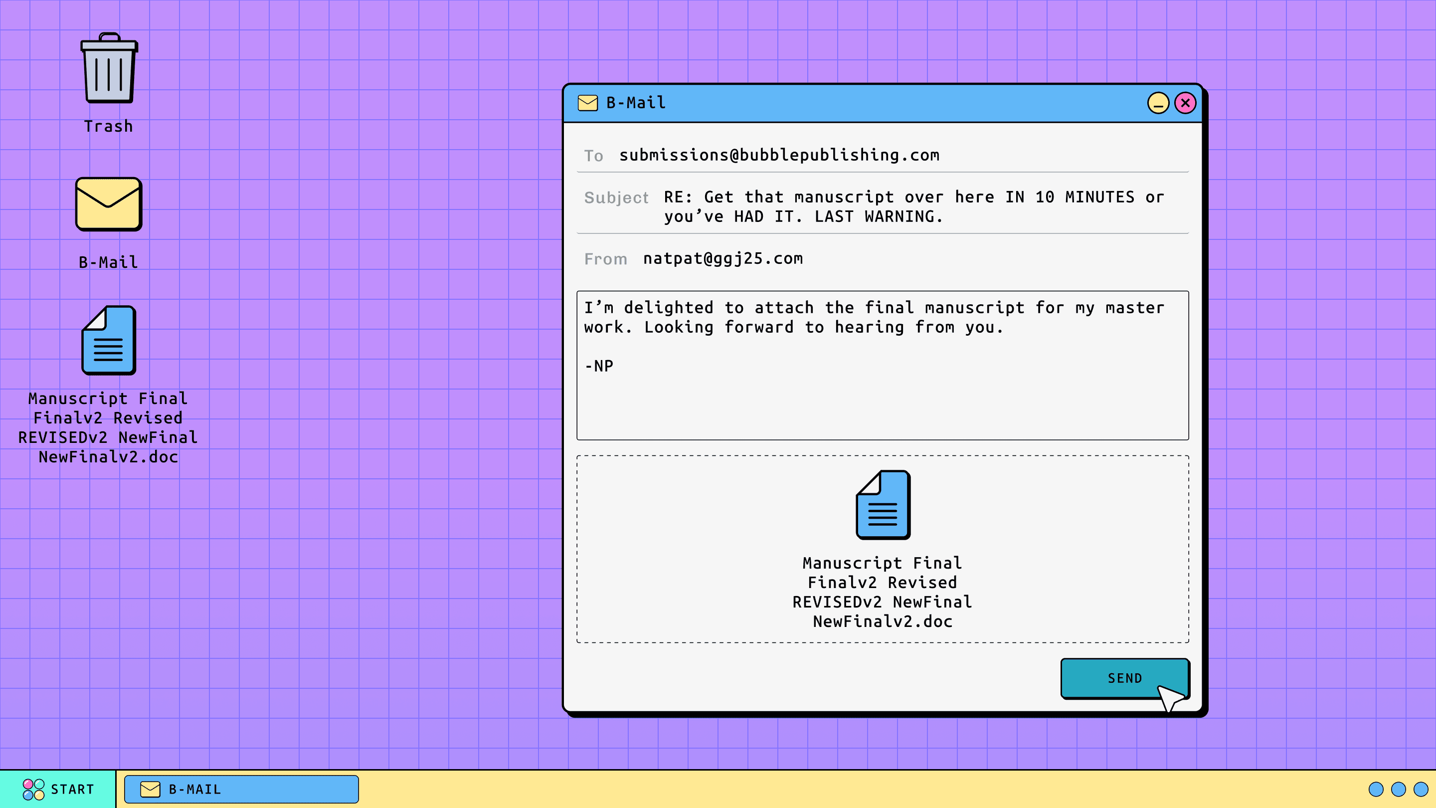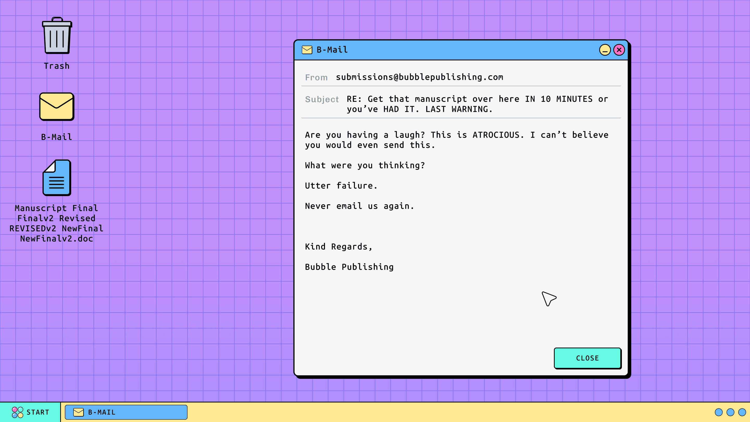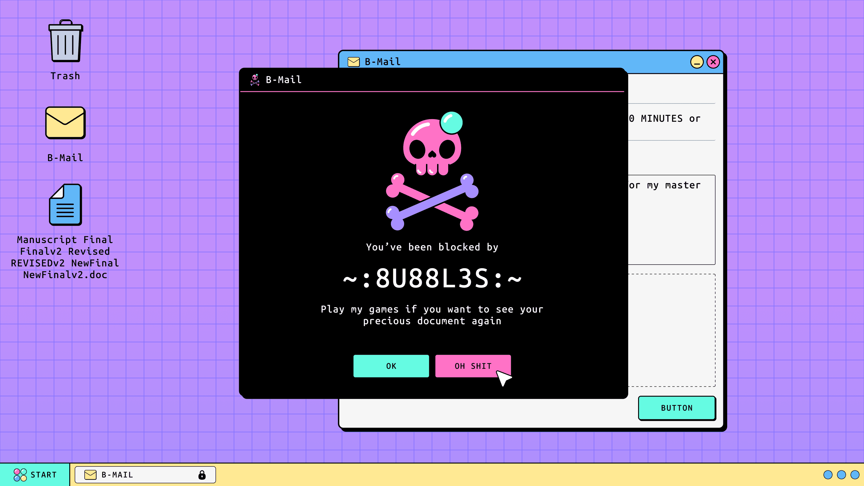 You are submitting your final, final v2, NEWFINAL manuscript to your publisher, it's an absolute masterpiece - but time is running tight. Disaster strikes as you get hacked while submitting your file! Play the new minigames that have turned up on your desktop, once the hacker is sufficiently amused they may release your file...